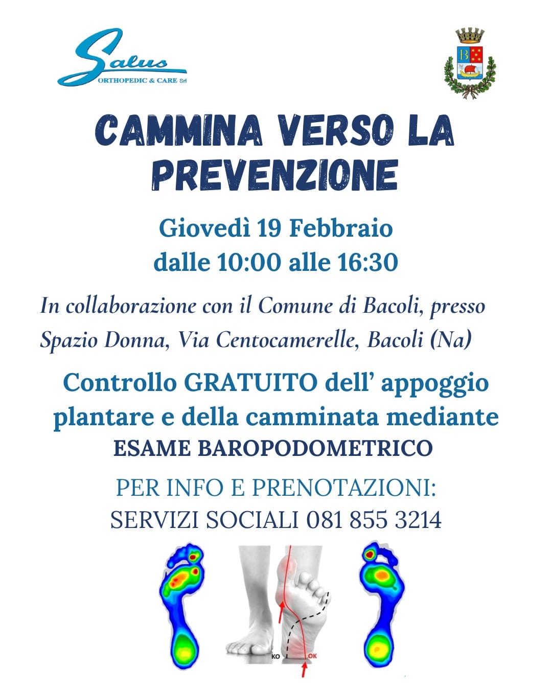 Mettere "il piede giusto" nella prevenzione non è mai stato così semplice. Il Comune di Bacoli, in stretta collaborazione con Salus Orthopedic & Care Srl, promuove un’importante iniziativa dedicata alla salute posturale e al benessere dei cittadini: "Cammina verso la prevenzione". L’appuntamento è fissato per giovedì 19 febbraio, dalle ore 10.00 alle ore 16.00 presso Spazio Donna, Via Centocamerelle, Bacoli (NA) una giornata interamente dedicata allo screening gratuito del passo e dell’appoggio plantare.