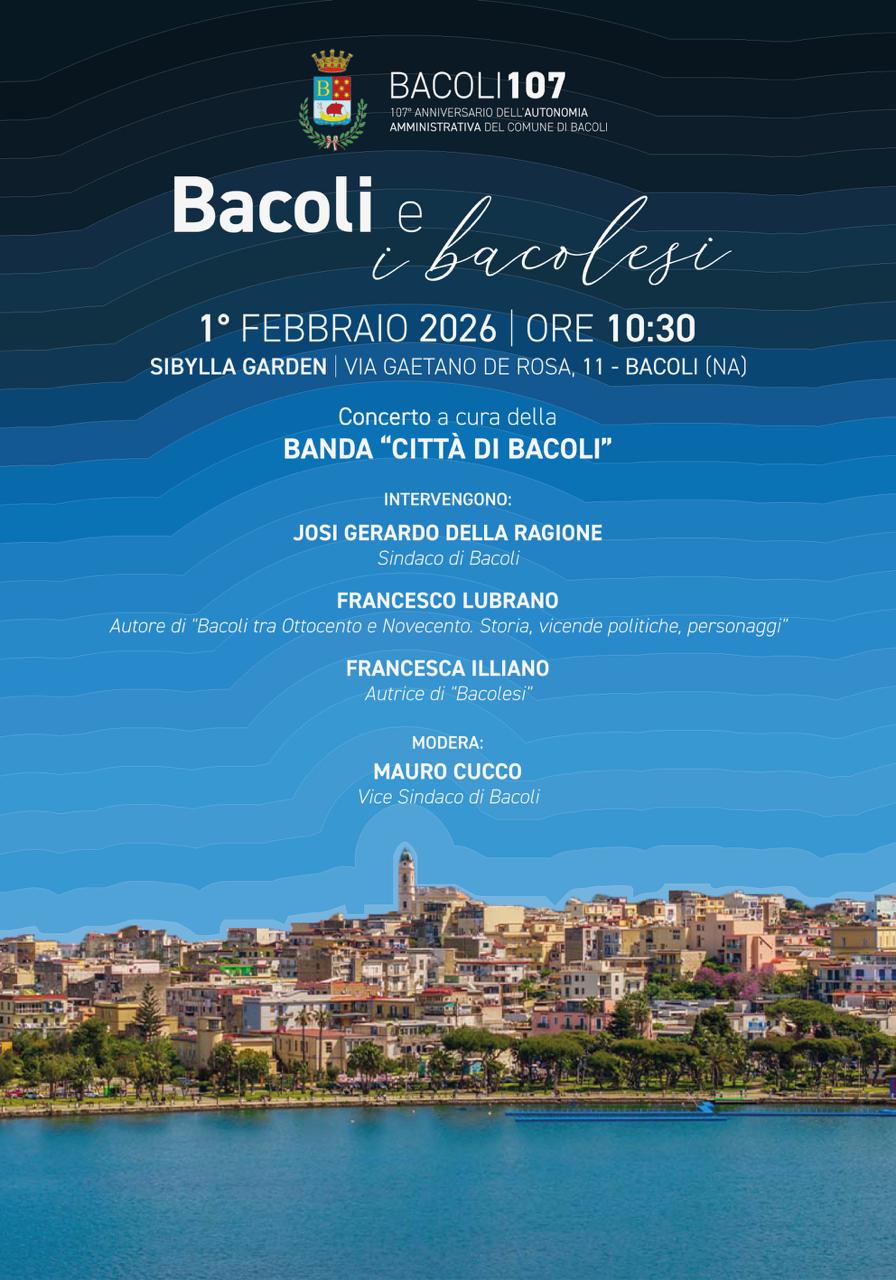 Il Comune di Bacoli celebra i 107 anni dell’autonomia amministrativa con un appuntamento pubblico dedicato alla memoria, all’identità e al senso di comunità. Domenica 1 febbraio 2026, alle ore 10:30, nello splendido scenario del Sibilla Garden, in pieno centro storico, si terrà l’evento “Bacoli e i bacolesi”, promosso dal Comune di Bacoli nell’ambito delle iniziative per il 107° anniversario dell’autonomia.