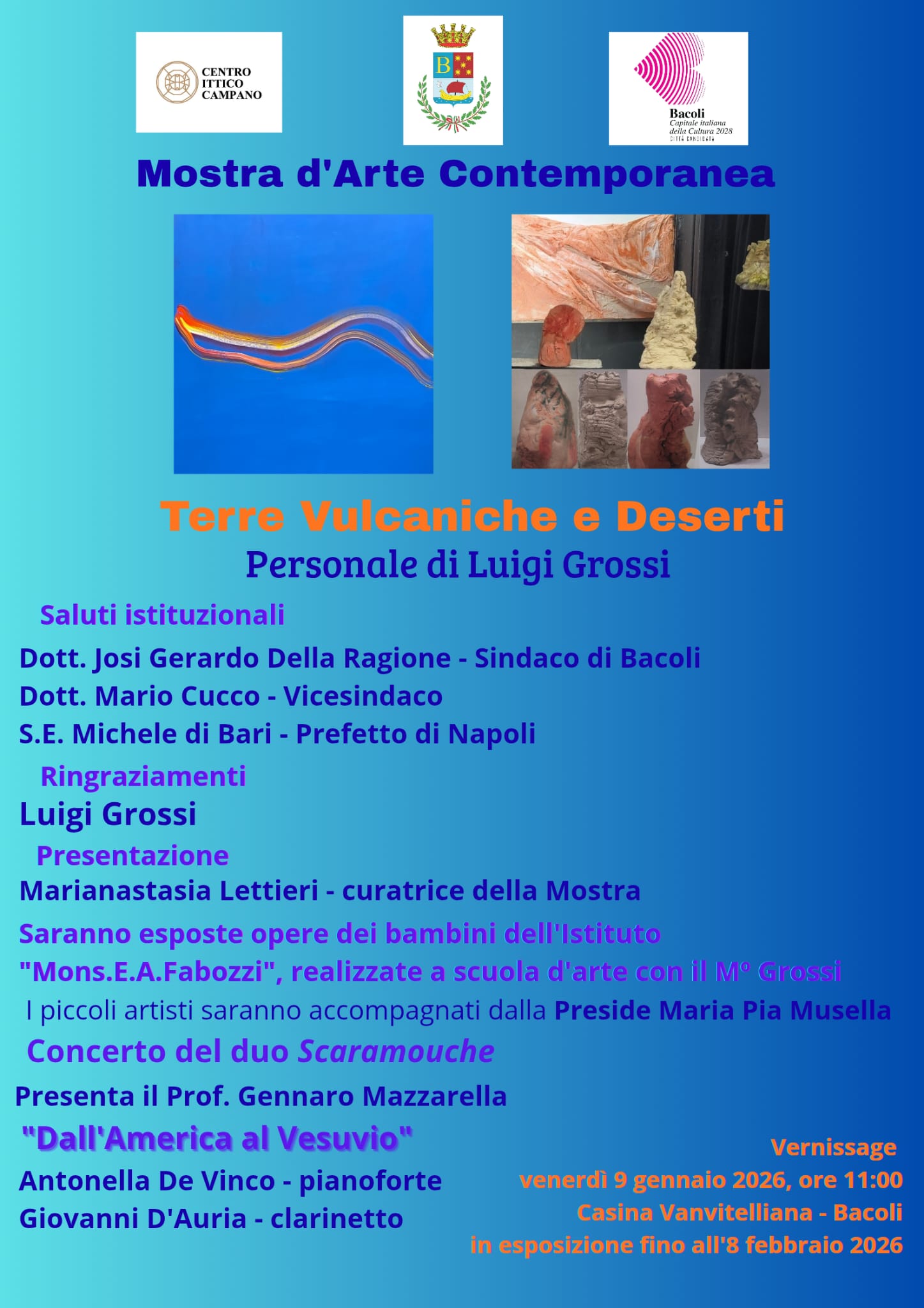 Per celebrare i 63 anni di creatività artistica l'artista partenopeo Luigi Grossi inaugura la personale "Terre Vulcaniche e Deserti" venerdì 9 gennaio 2026 ore 11:00 al Fusaro presso la Casina Vanvitelliana a Bacoli, in corso fino all'8 febbraio 2026.