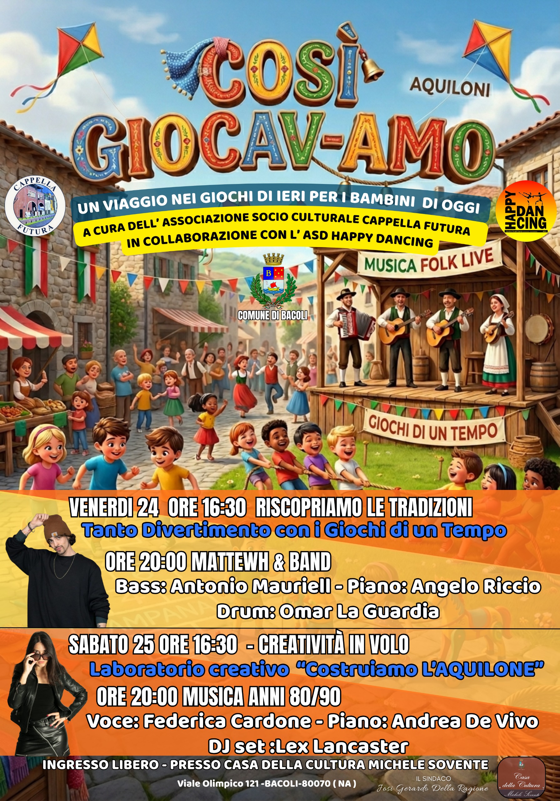 - Alle ore 16:30 il laboratorio creativo "Così Giocav-AMO", rivolta ai bambini e agli anziani, nelle giornate del 24-25 aprile presso la Casa della Cultura;