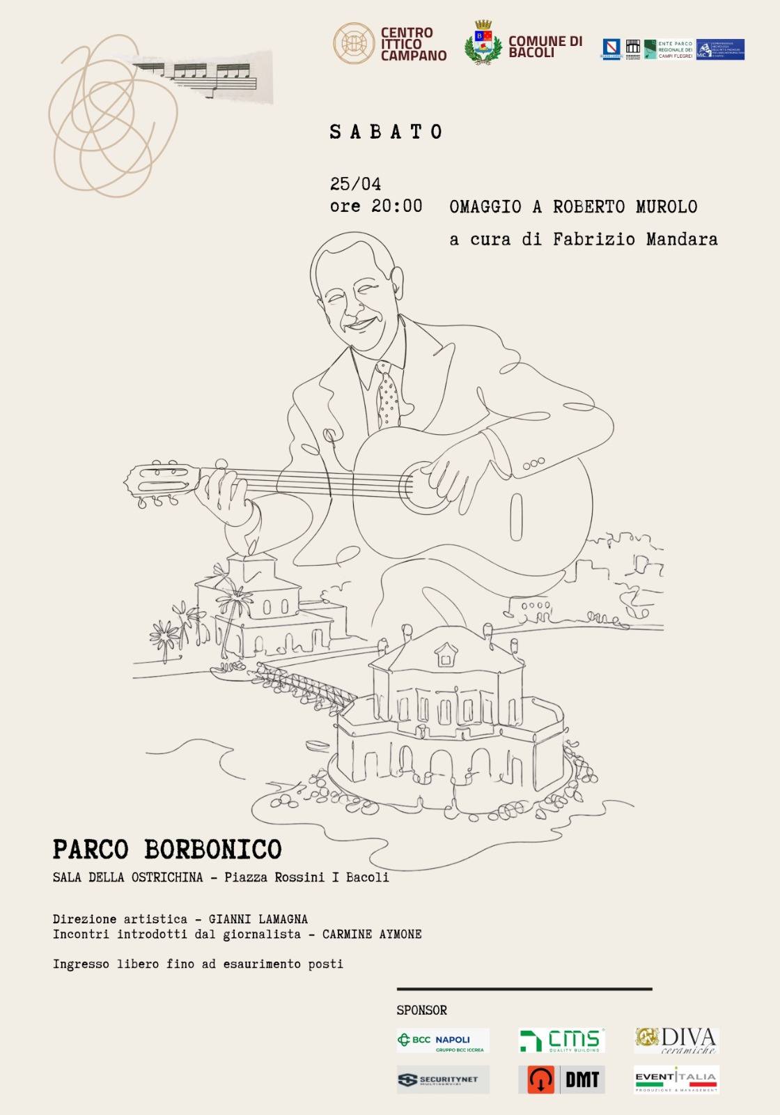 - Alle ore 20:00 il concerto musicale di Fabrizio Mandara "Omaggio a Roberto Murolo", primo appuntamento della rassegna musicale e culturale "Primavera al Parco Borbonico" (ingresso libero e gratuito fino ad esaurimento posti).