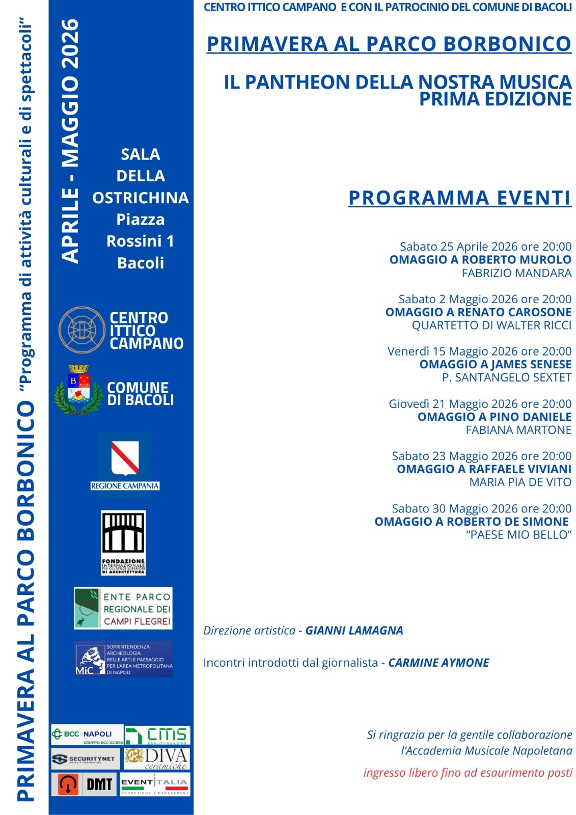 Dal 25 aprile al 30 maggio 2026, negli spazi di straordinario valore storico e paesaggistico del Parco Borbonico del Fusaro a Bacoli, prende vita la prima edizione della rassegna musicale e culturale “Primavera al Parco Borbonico”, promossa dal Centro Ittico Campano con il patrocinio del Comune di Bacoli. Un progetto artistico che coniuga musica, narrazione e valorizzazione del territorio, proponendosi come un viaggio emozionale nella grande tradizione musicale partenopea.