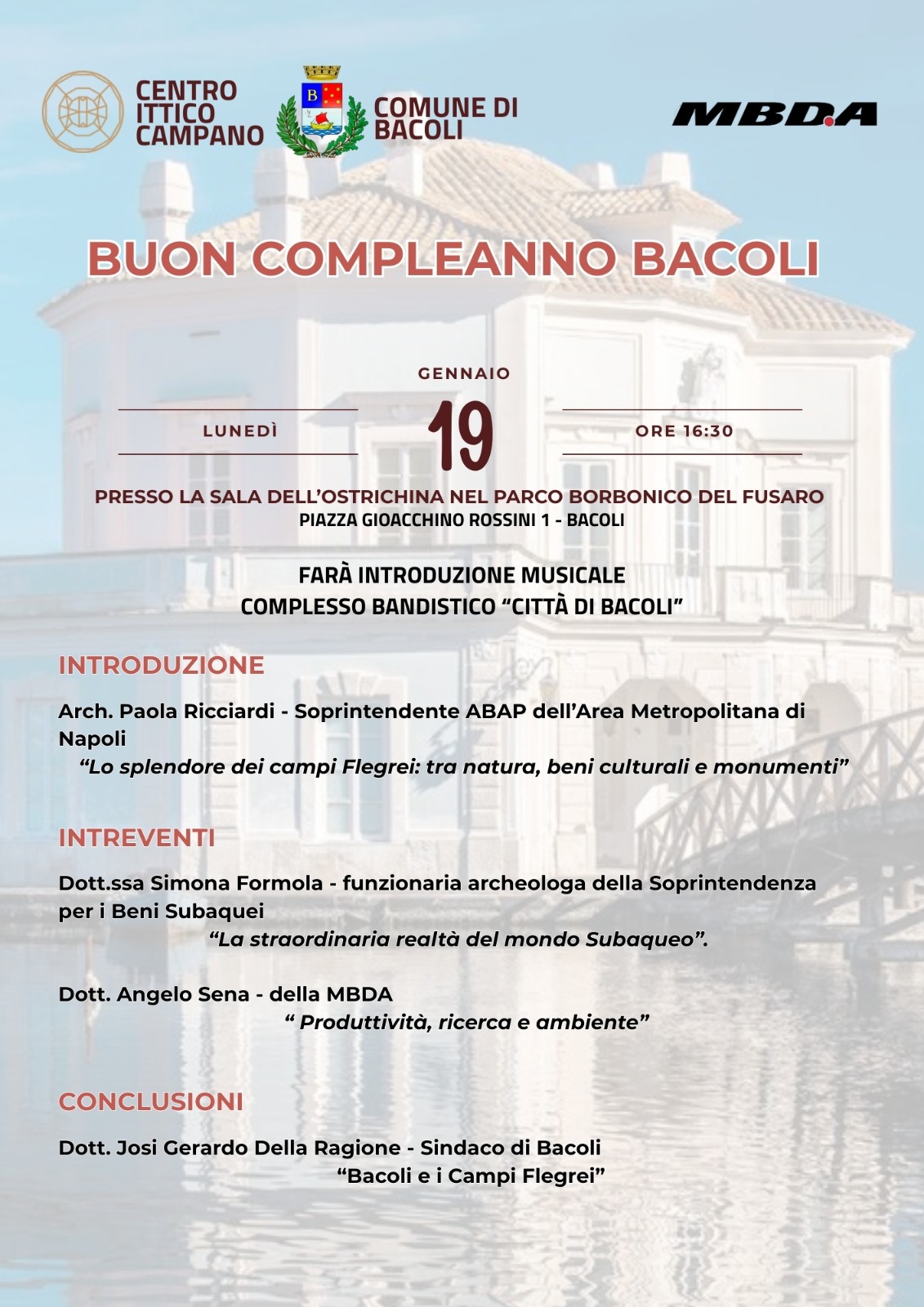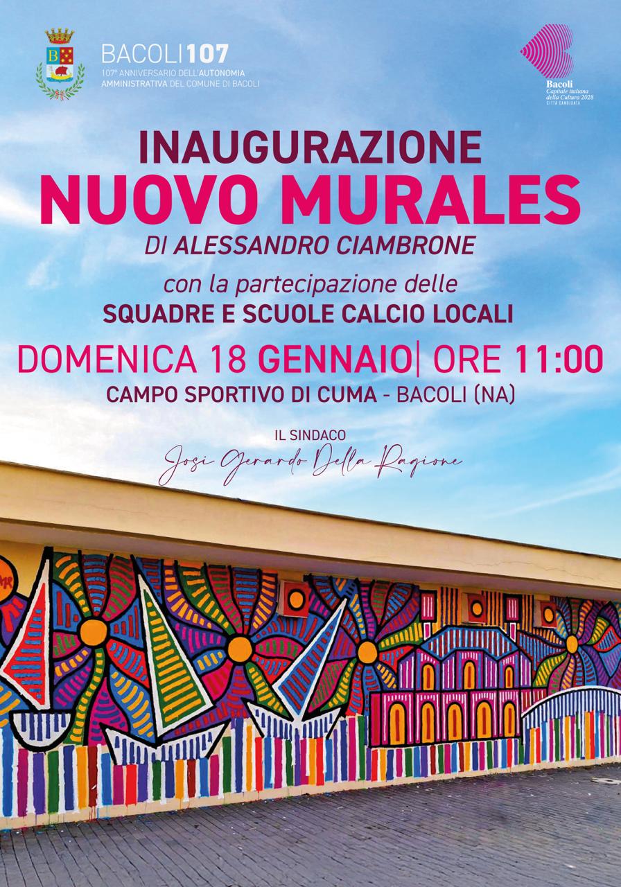 La prima si tiene domenica 18 gennaio, alle ore 11:00, presso il campo sportivo di Cuma con l'inaugurazione del murales realizzato dall'artista Alessandro Ciambrone. Un'opera ricca di significato, a sostegno della candidatura di Bacoli a Capitale Italiana della Cultura per il 2028 e che vuole essere un omaggio anche agli sport acquatici, con il richiamo alla Casina Vanvitelliana ed in prospettiva America’s Cup 2027 che coinvolgerà tutto il golfo di Napoli. L'artista Alessandro Ciambrone ha da poco ottenuto il premio da Guinness World Record, per aver realizzato sulla facciata della Casa Circondariale di Santa Maria Capua Vetere il murales più grande del mondo. Bacoli può già vantare tante sue realizzazioni tra gli ex spogliatoi che affacciano sul Lago Maremorto e l'ex Caffé Letterario nel quartiere di Cento Camerelle.
